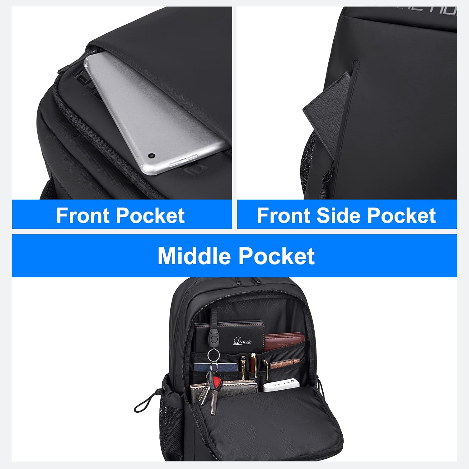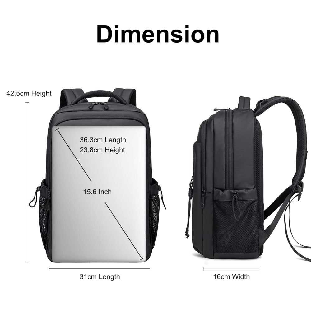 [Purposeful Mutil-pocket]— The 6 pockets of the laptop backpack have clear divisions for use, The main pocket is with 2 electronic compartments can well protect your electronic products,can store 10.9-inch tablet and 15.6-inch Laptop. Middle pocket has a removable key holder and 5 compartments for pen, phone, notebook, power bank etc.The front pocket is anti-theft design. The front side pocket can be put into non-valuable daily items.2 side pocket on both sides can put water bottle and umbrella.